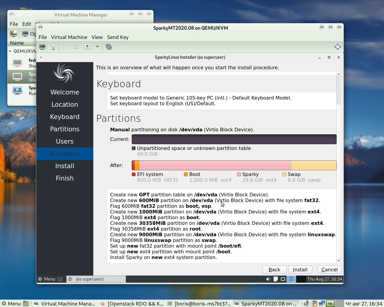 Following below is verification deployment os SparkyLinux 2020.08 as KVM